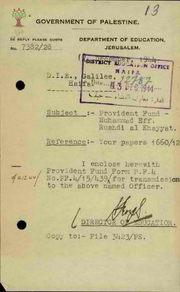 رسالة من مدير المعارف الى مفتش المعارف بخصوص صندوق الاحتياط للمعلم محمد رشدي الخياط