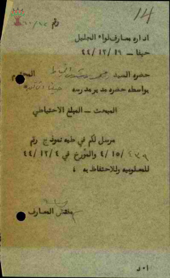 رسالة من مفتش المعارف الى المعلم محمد رشدي الخياط بخصوص مبلخ الاحتياط