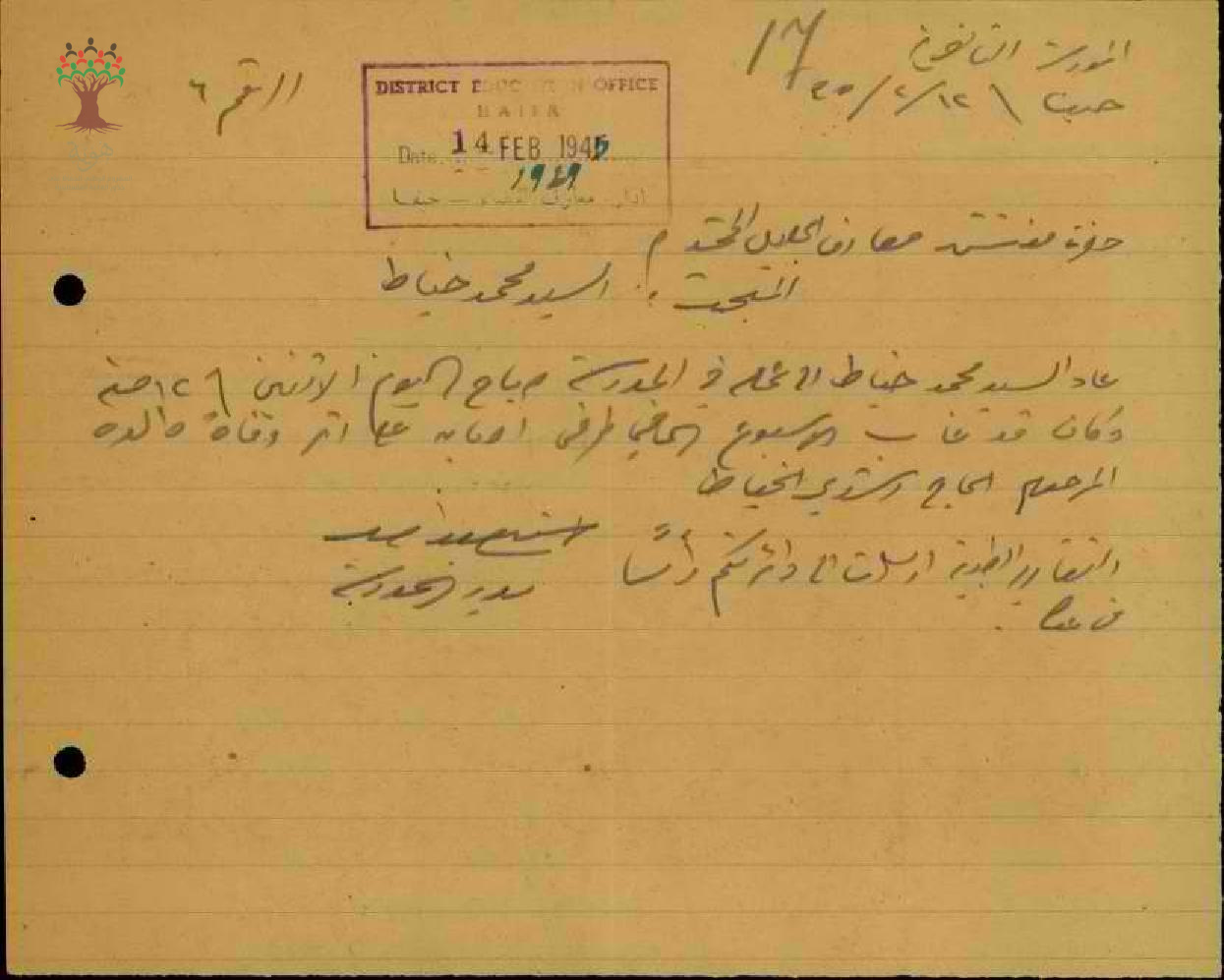 رسالة من مدير مدرسة حيفا الثانوية الى مفتش المعارف بخصوص غياب المعلم محمد رشدي الخياط لمدة اسبوع بسبب وفاة والده