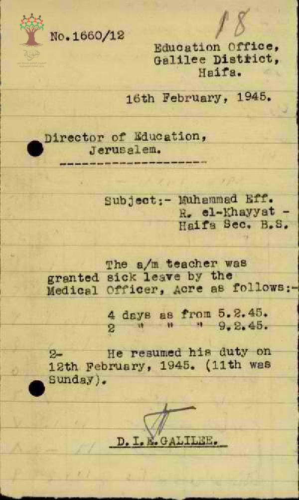 رسالة من مفتش المعارف الى مدير المعارف بخصوص غياب المعلم محمد رشدي الخياط وعودته للعمل