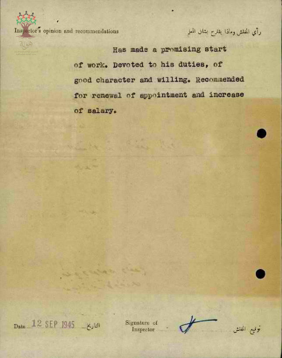 تقرير تفصيلي عن أداء المعلم محمد رشدي الخياط في مدرسة حيفا الثانوية سنة 1945