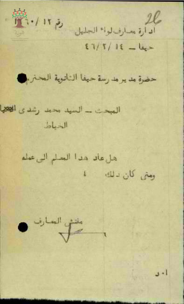 رسالة من مفتش المعارف الى مدير مدرسة حيفا يسأله عن عودة المعلم محمد رشدي الخياط الى عمله