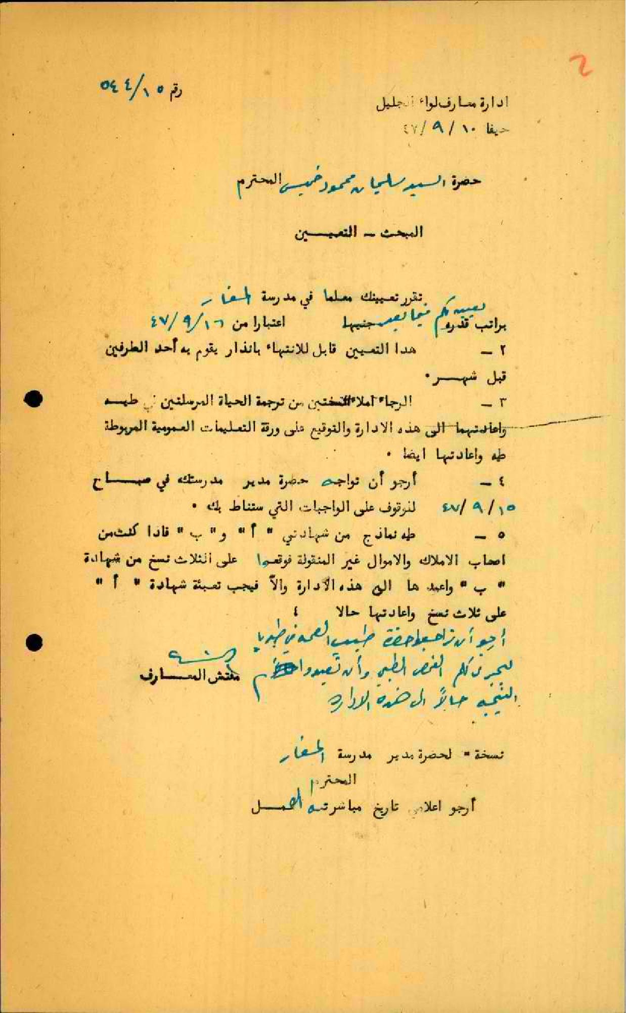 رسالة من مفتش المعارف إلى المعلم سليمان خميس يخبره بقرار تعببنه معلماً ف مدرسة المغار