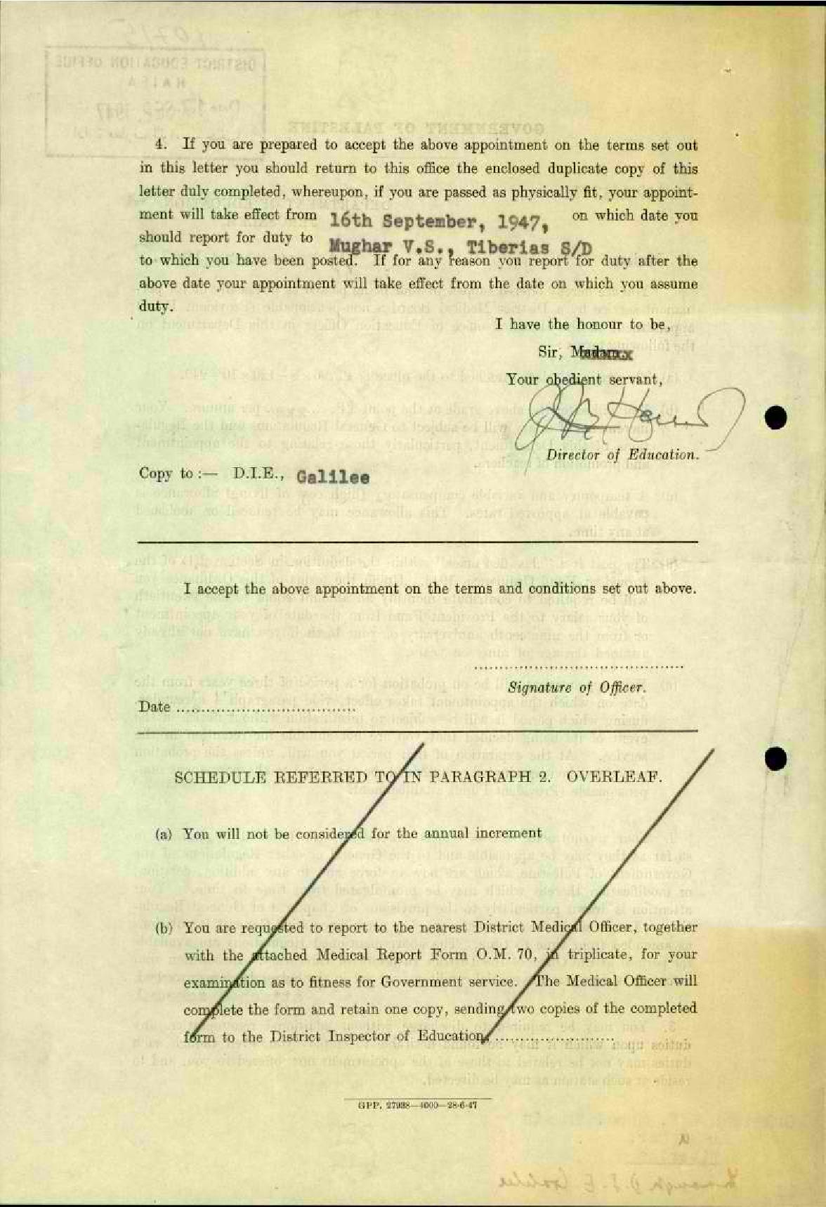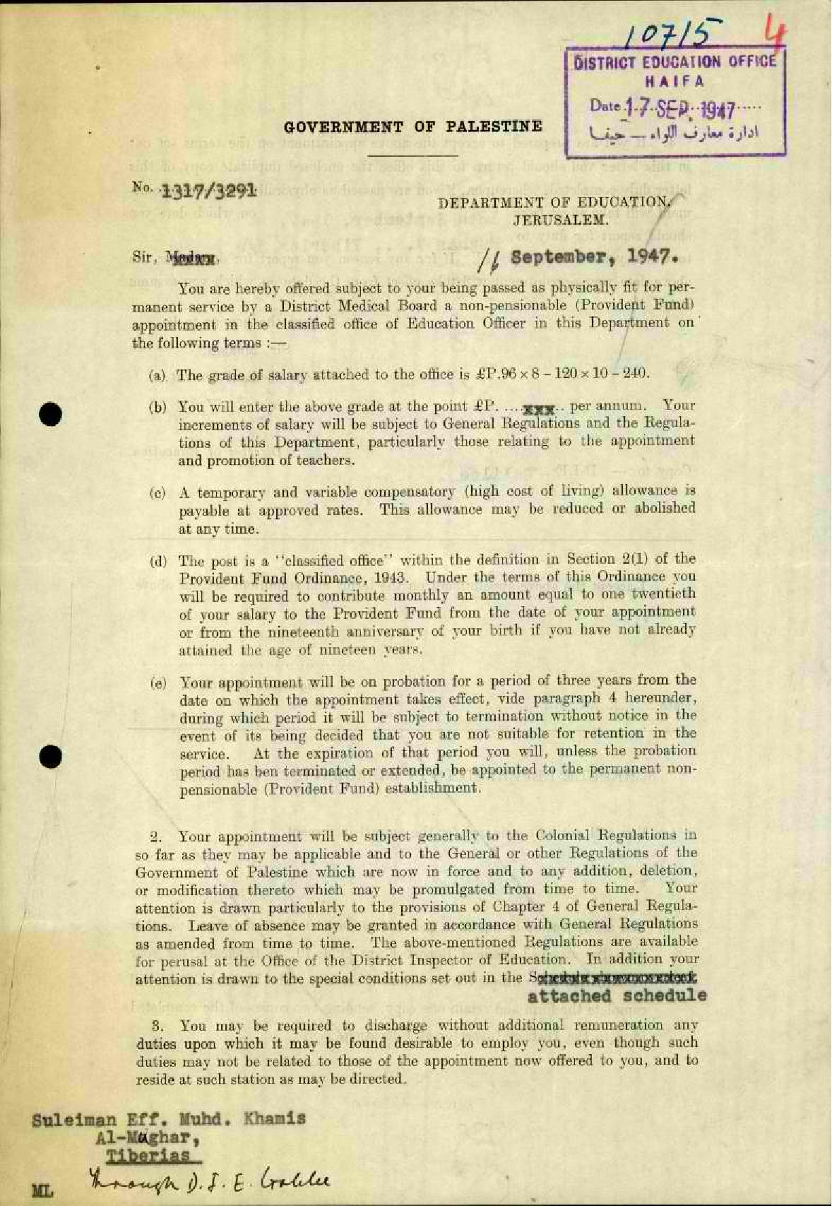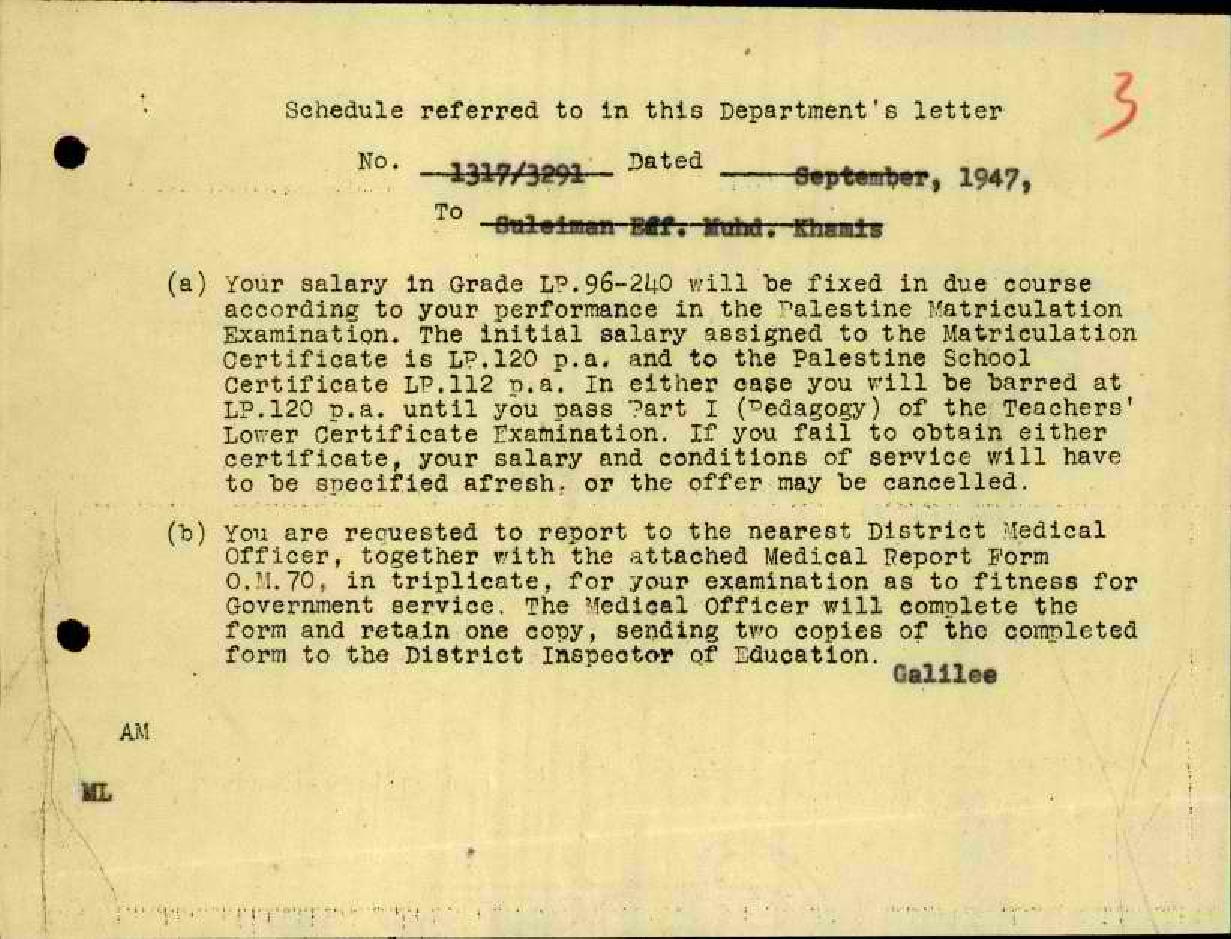 قرار تعيين المعلم سليمان خميس ف مدرسة المغار يرسله مدير المعارف