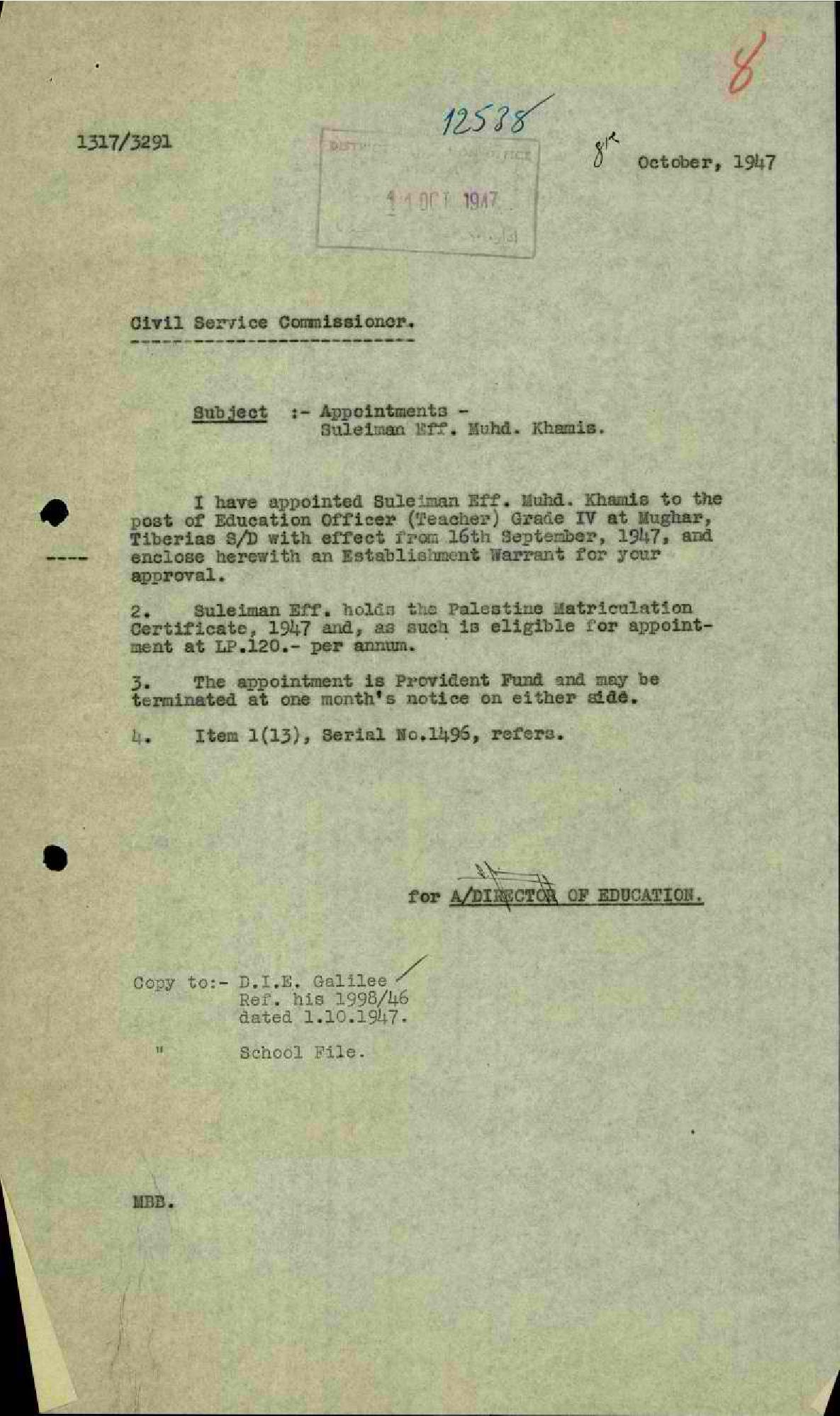 رسالة من مدير المعارف إلى مفوض الخدمة المدنية يبحث فيها تعين المعلم سليمان خميس في الإدارة