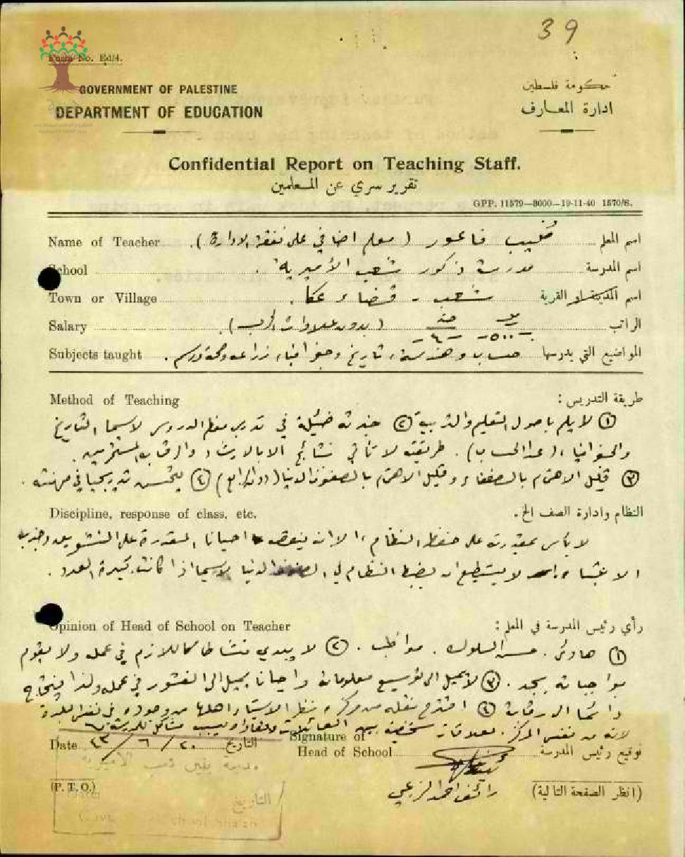 تقرير تفصيلي عن أداء المعلم منيب فاعور في مدرسة ذكور شعب الاميرية سنة 1943 بتوقيع رئيس المدرسة رائف احمد الزعبي