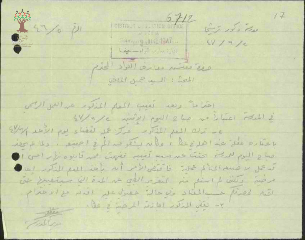 رسالة من مدير مدرسة ترشيحا الى مفتش المعارف بخصوص تغيب المعلم جميل ماضي بسبب عملية اجراها لأصبعه