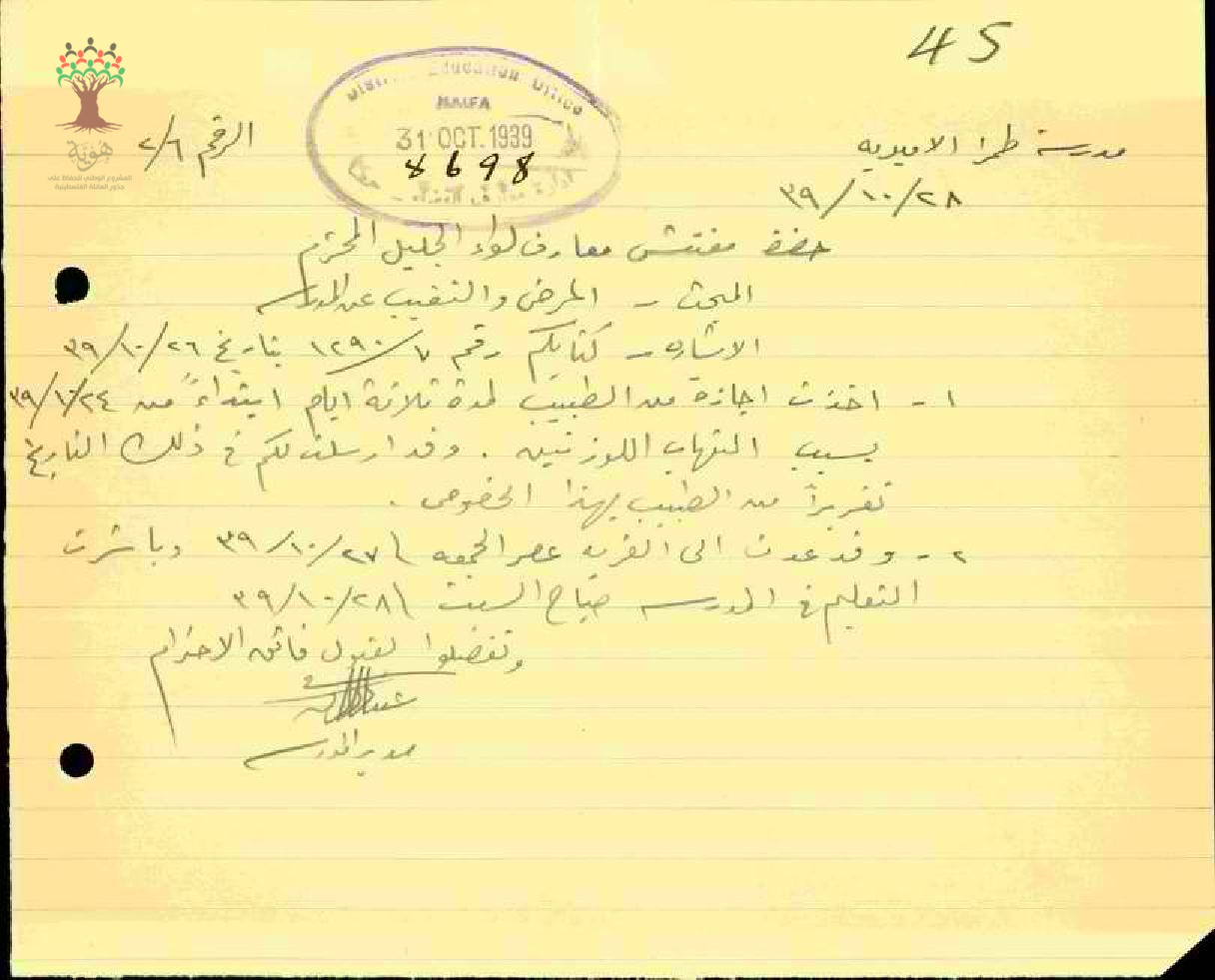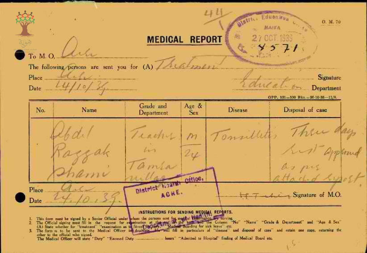 رسالة من المعلم عبد الرزاق الشامي الى مفتش المعارف بخصوص التغيب عن المدرسة مرفقة بالتقارير الطبية