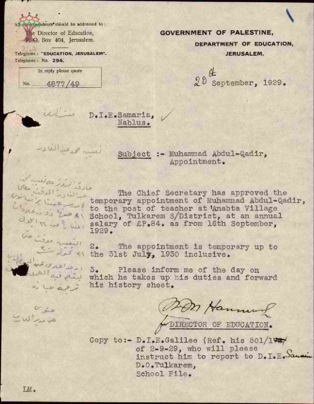 رسالة من مدير المعارف إلى مفتش السامرة-نابلس يخبره بأن السكرتير العام صادق على تعيين المعلم محمد عبد القادر عكاشة معلماً في مدرسة عنبتا