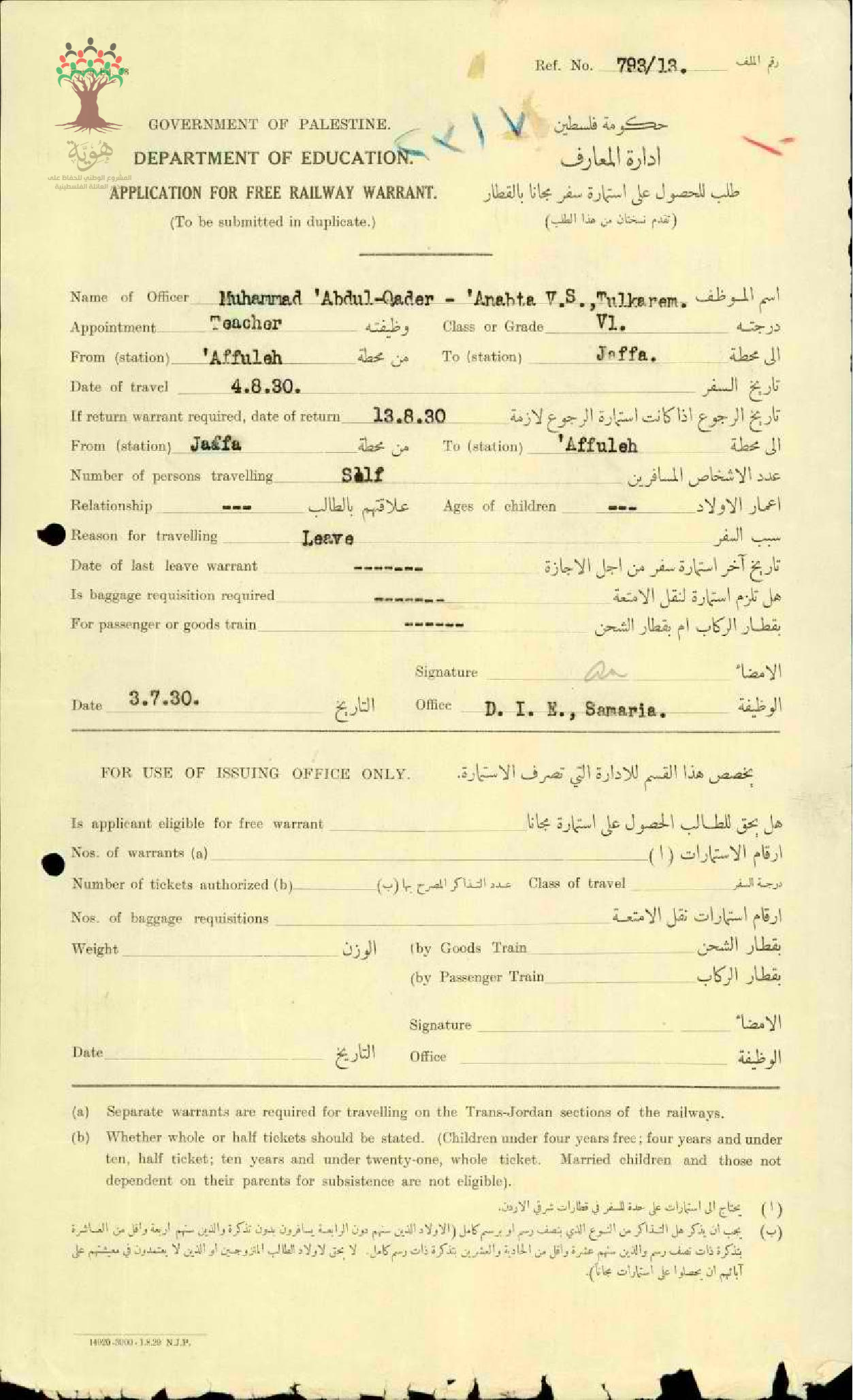 طلب للحصول على استمارة سفر مجاناً بالقطار للمعلم محمد عكاشة
