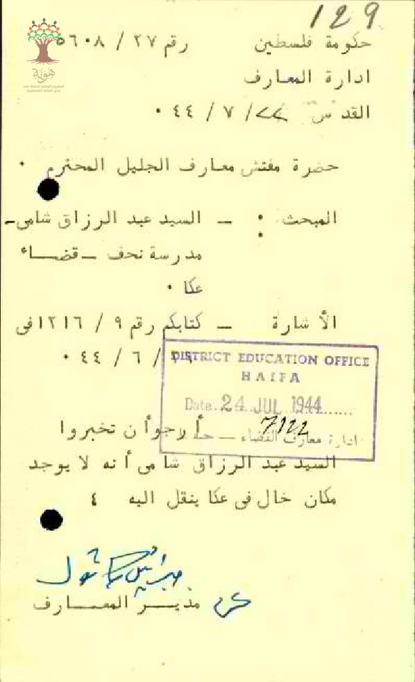 رسالة من مدير المعارف الى مفتش المعارف يعلمه بعدم امكانية نقل المعلم عبد الرزاق الشامي الى عكا