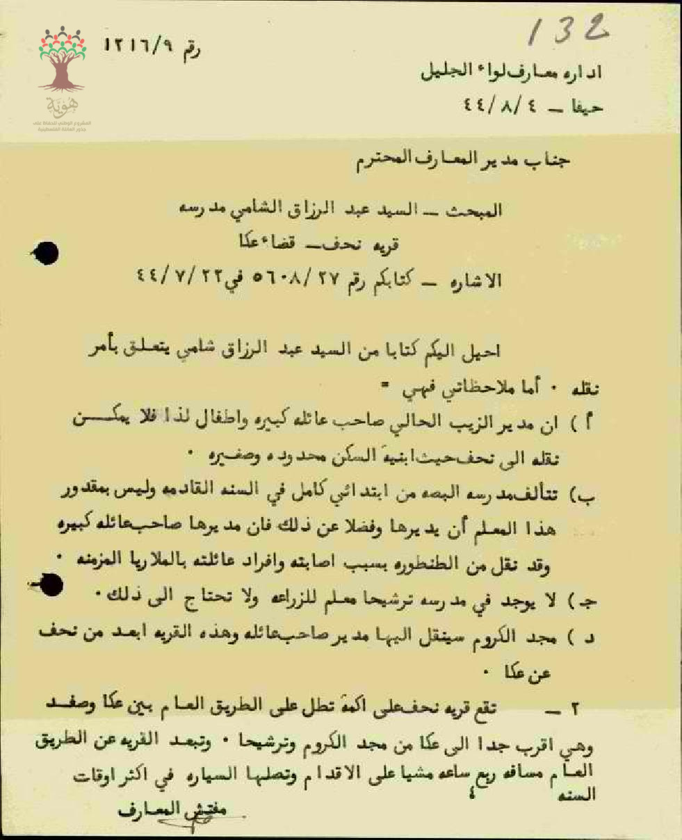 رسالة من مفتش المعارف الى مدير المعارف بخصوص طلب نقل المعلم عبد الرزاق الشامي