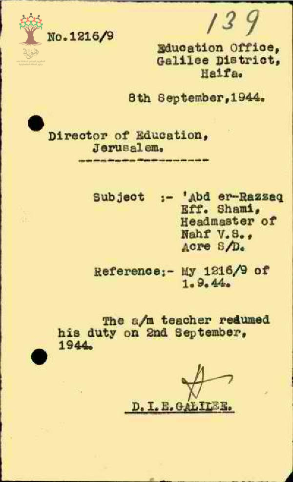 رسالة من مفتش المعارف الى مدير المعارف يعلمه بعودة المعلم عبد الرزاق الشامي من اجازته المرضية