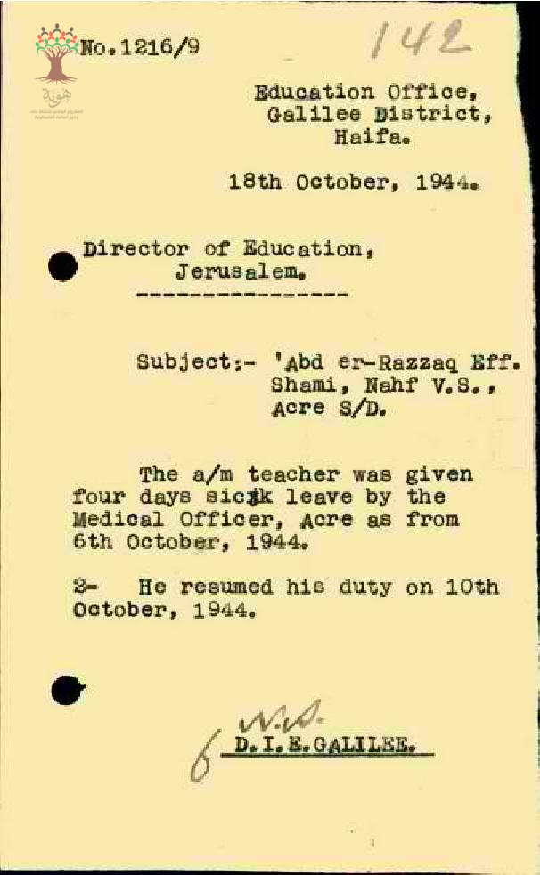 رسالة من مفتش المعارف الى مدير المعارف بخصوص اجازة مرضية للمعلم عبد الرزاق الشامي وعودته للعمل