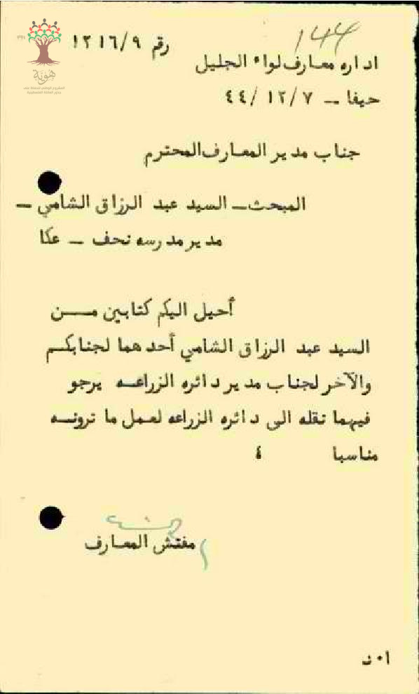 رسالة من مفتش المعارف الى مدير المعارف بخصوص طلب نقل المعلم عبد الرزاق الشامي الى دائرة الزراعة