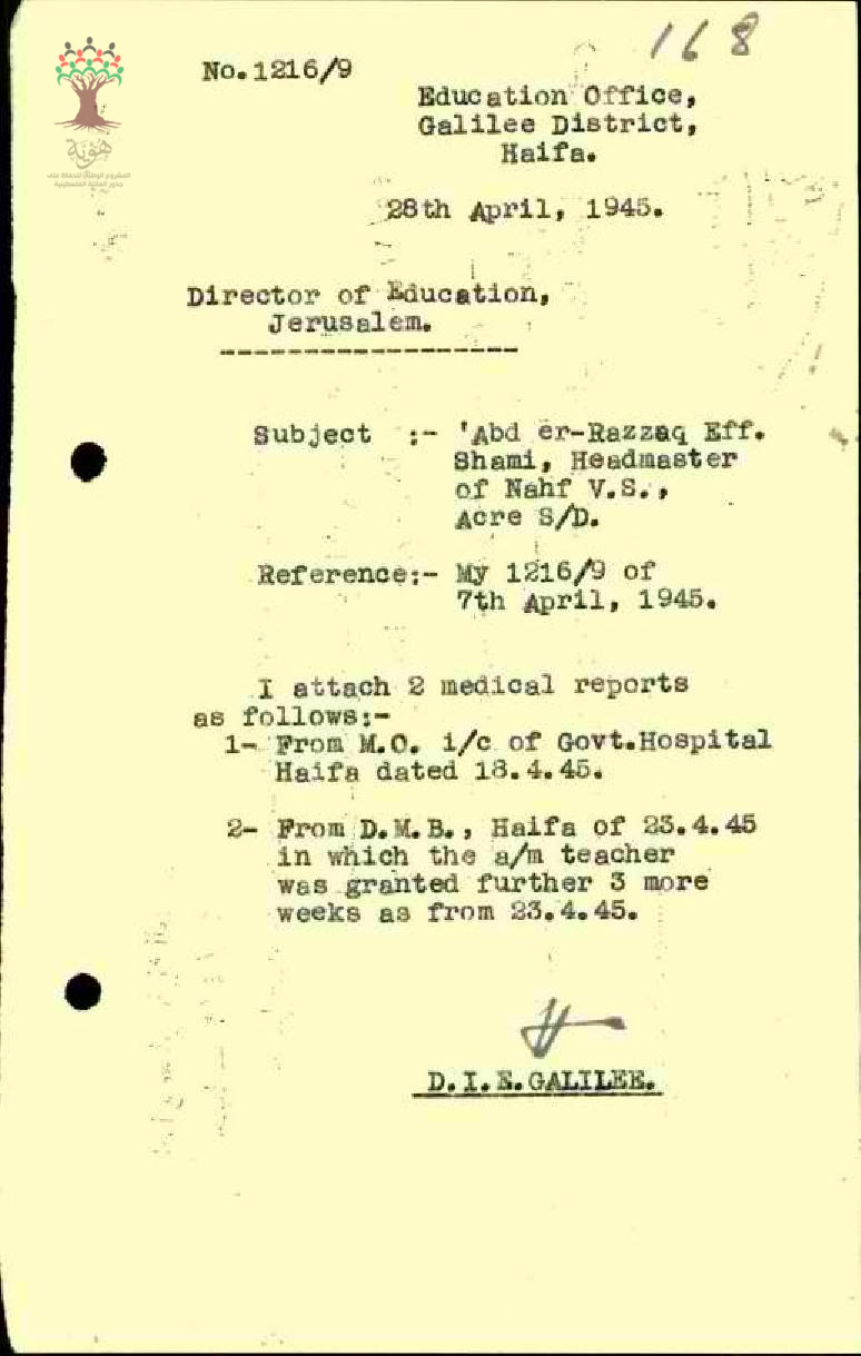 رسالة من مفتش المعارف الى مدير المعارف مرفقاً تقارير طبية للمعلم عبد الرزاق الشامي