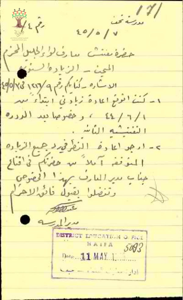 رسالة من المعلم عبد الرزاق الشامي الى مفتش المعارف بخصوص زيادته السنوية