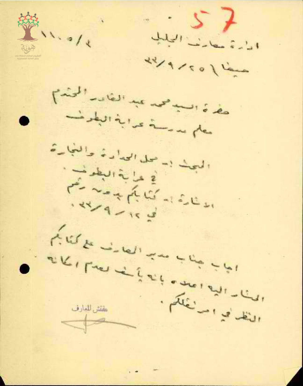 رسالة من مفتش المعارف إلى المعلم محمد عكاشة يبحث معه أمر محل الحدادة والنجارة في عرابة البطوف