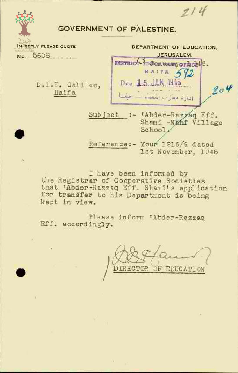 رسالة من مدير المعارف الى مفتش المعارف يطلب منه اخبار المعلم عبد الرزاق الشامي بأن طلبه للنقل الى الجمعيات التعاونية قيد الدرس