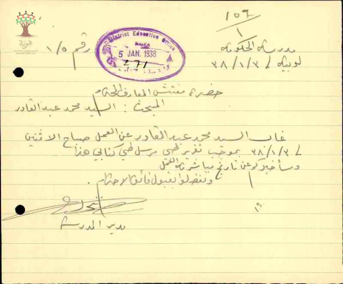 رسالة من مدير مدرسة لوبية إلى مفتش المعارف يعلمه بغياب المعلم محمد عكاشة بموجب تقرير طبي
