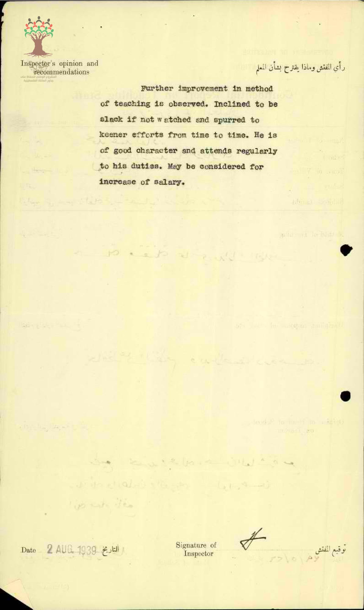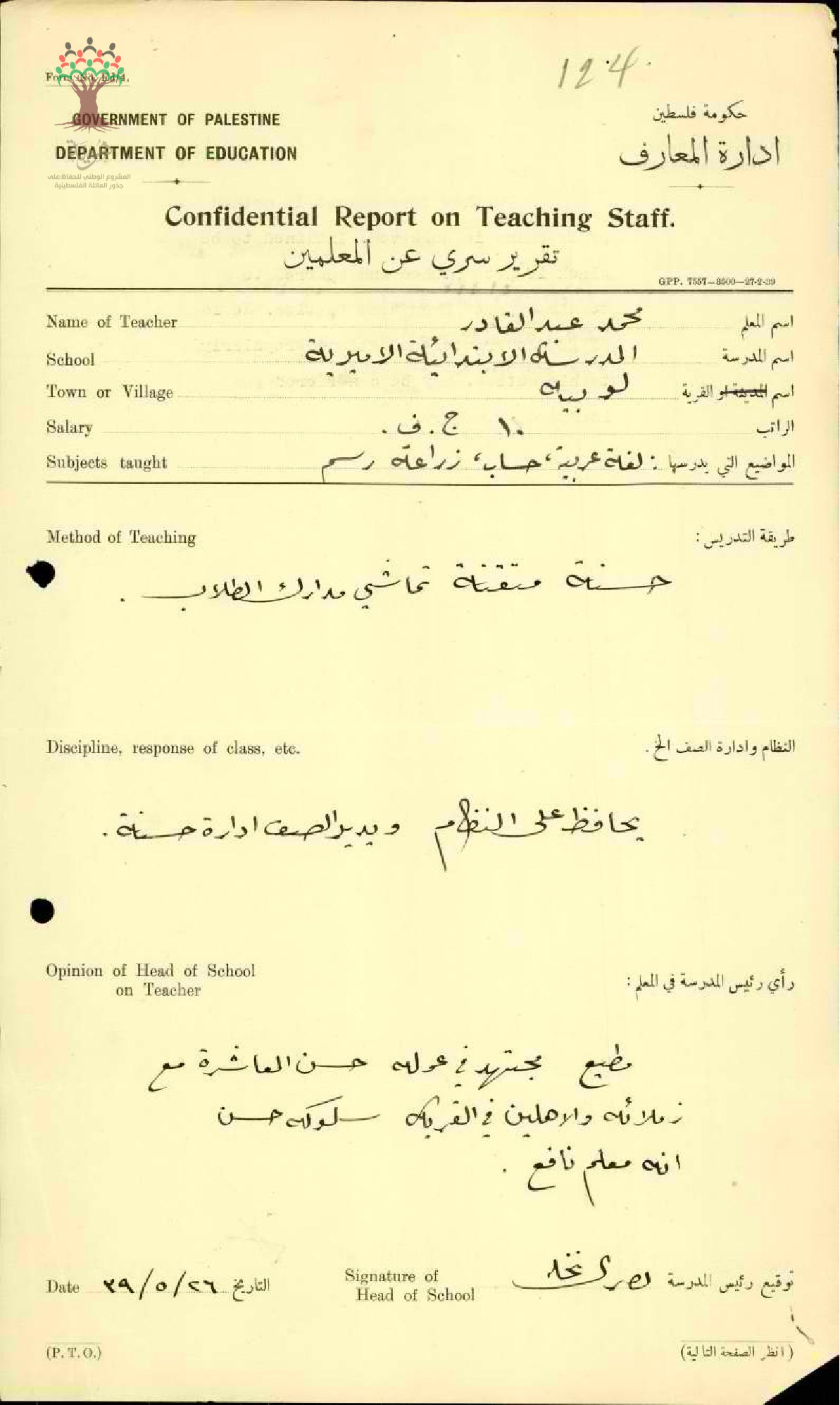 تقرير تفصيلي عن أداء المعلم محمد عكاشة في مدرسة لوبية سنة 1939
