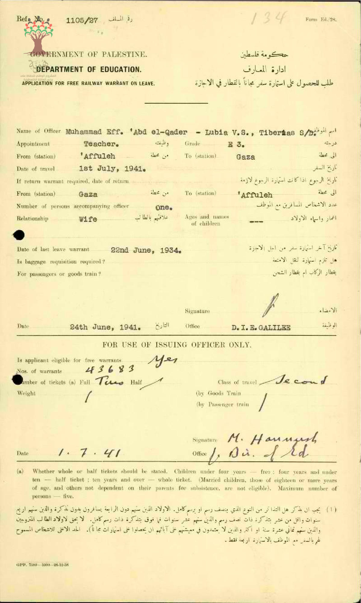 طلب للحصول على استمارة سفر مجاناً بالقطار في الاجازة للمعلم محمد عكاشة