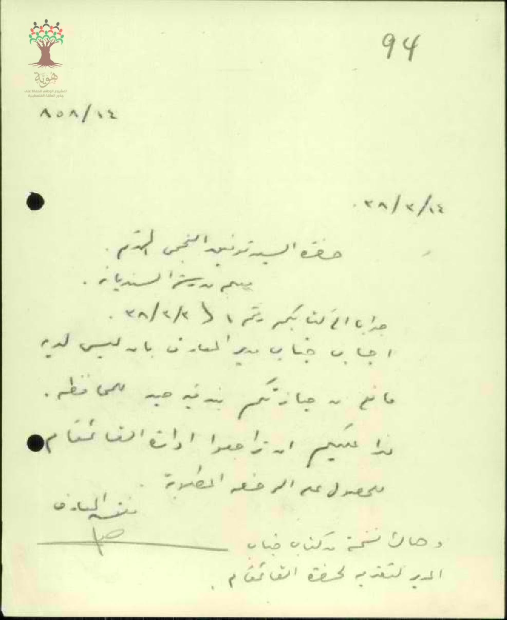 رساله من مفتش المعارف الى المعلم احمد توفيق النجمي اجابا مدير المعارف بان ليس لديه مانع ان يكون بحوزته بندقية صيد