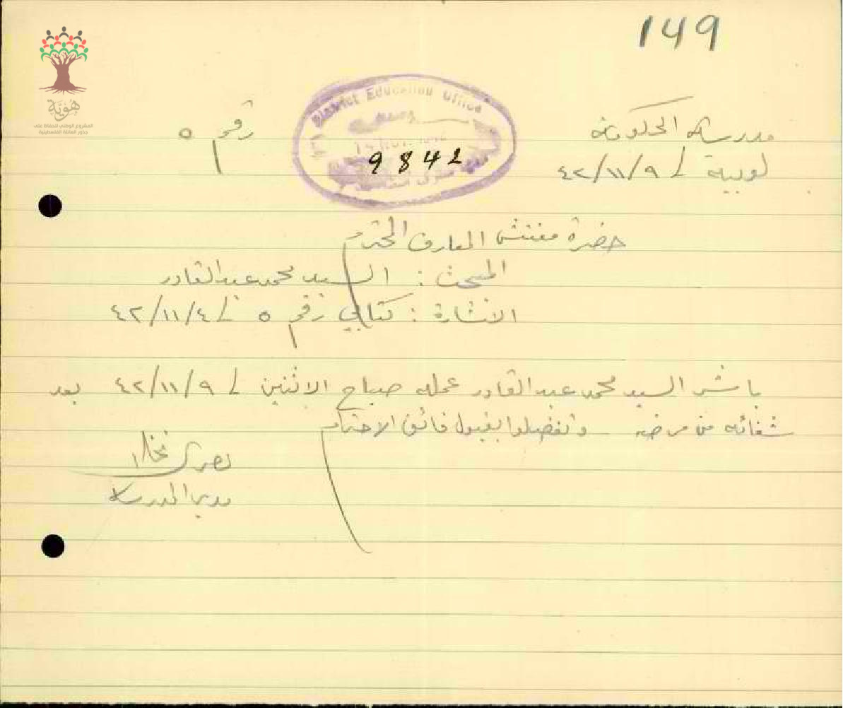 رسالة من مدير مدرسة لوبية إلى مفتش المعارف يخبره بعودة المعلم محمد عكاشة إلى عمله في المدرسة
