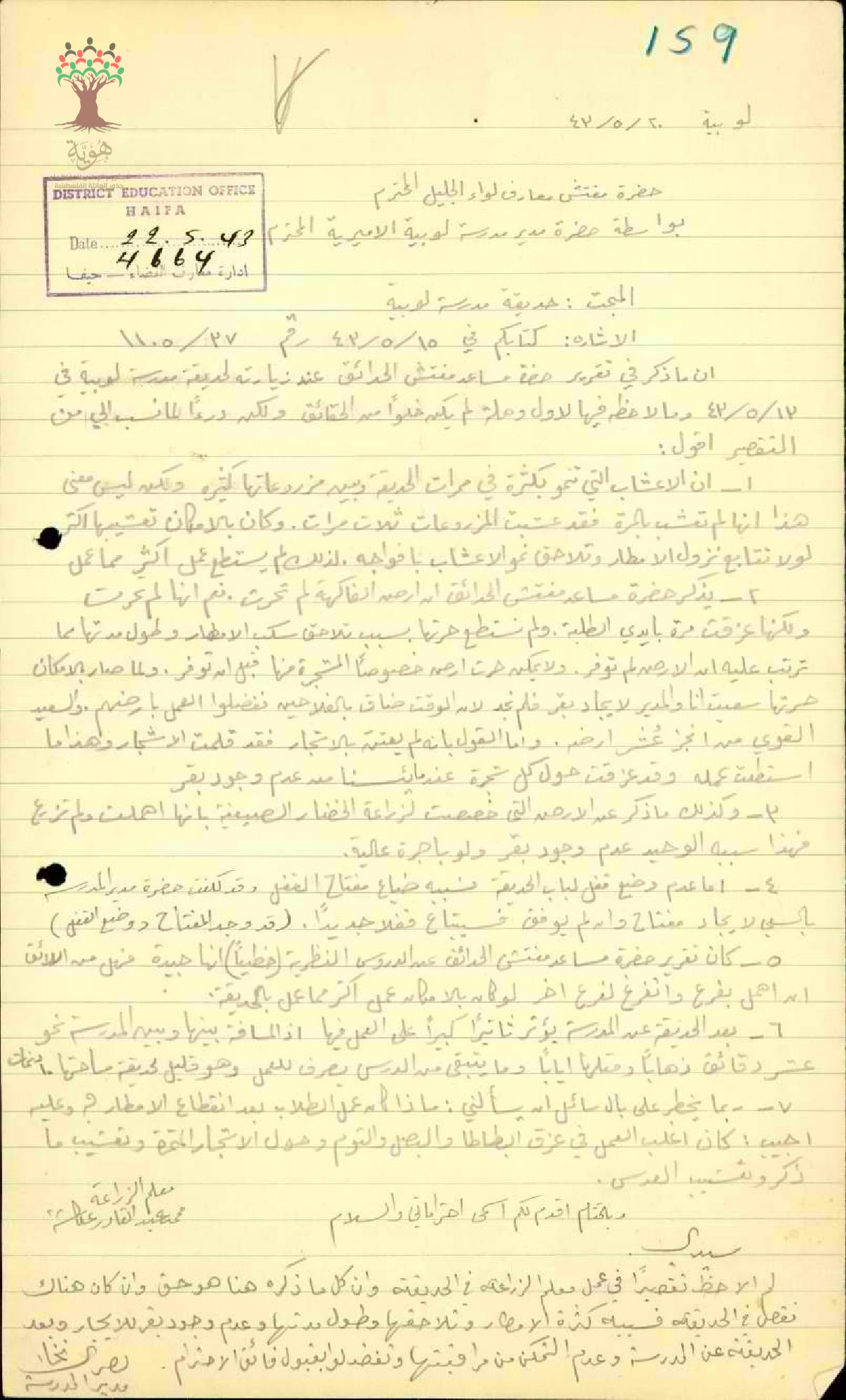 رسالة من المعلم محمد عكاشة إلى مفتش المعارف بخصوص حالة حديقة مدرسة لوبية