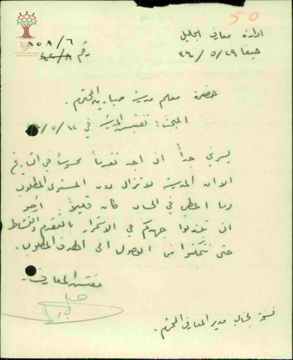 رسالة من معارف الجليل إلى إدارة معارف الجليل بخصوص تفتيش المدرسة