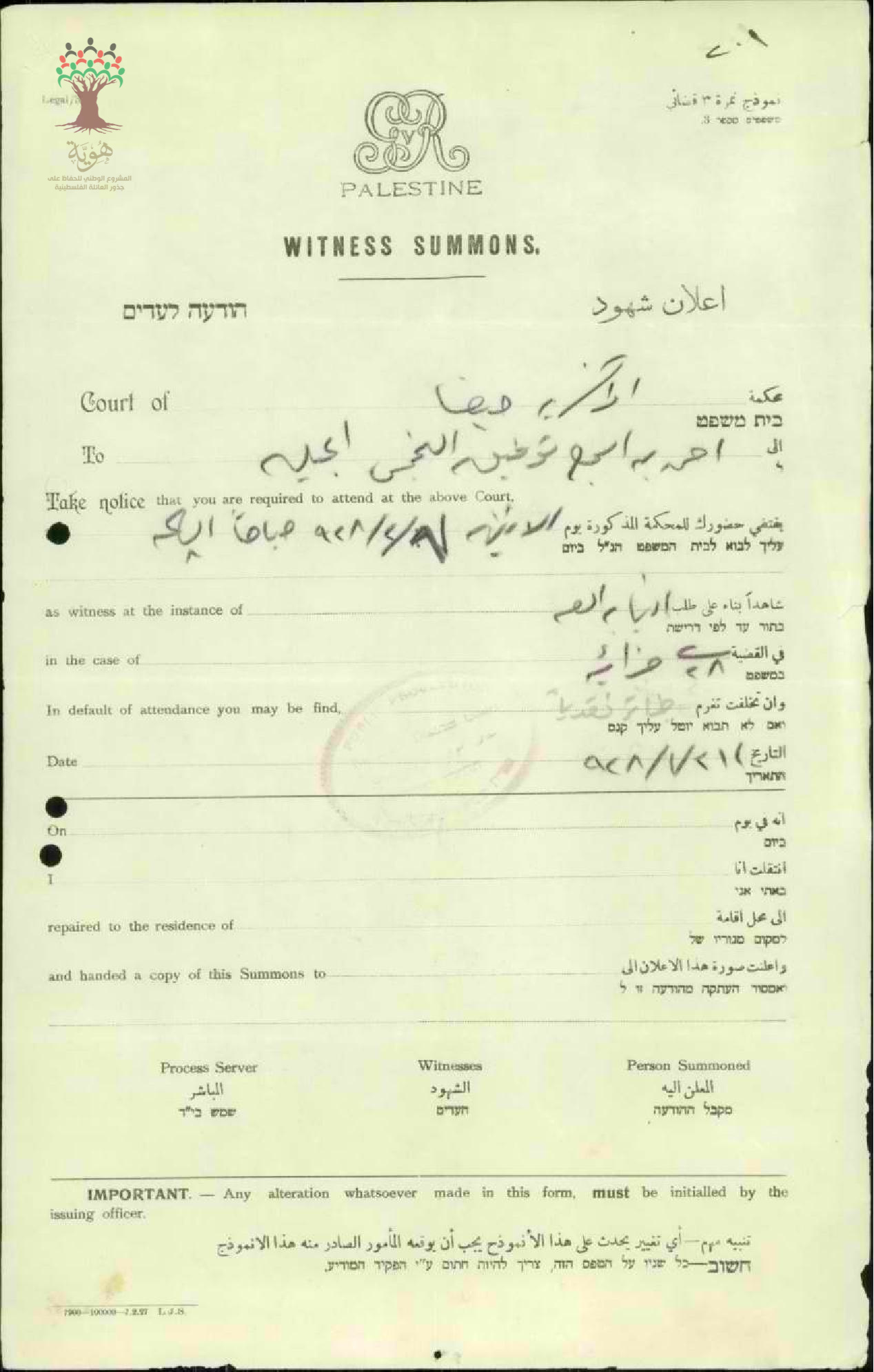 رساله من محكمه حيفا الى المعلم احمد توفيق النجمي بخصوص اعلان شهود