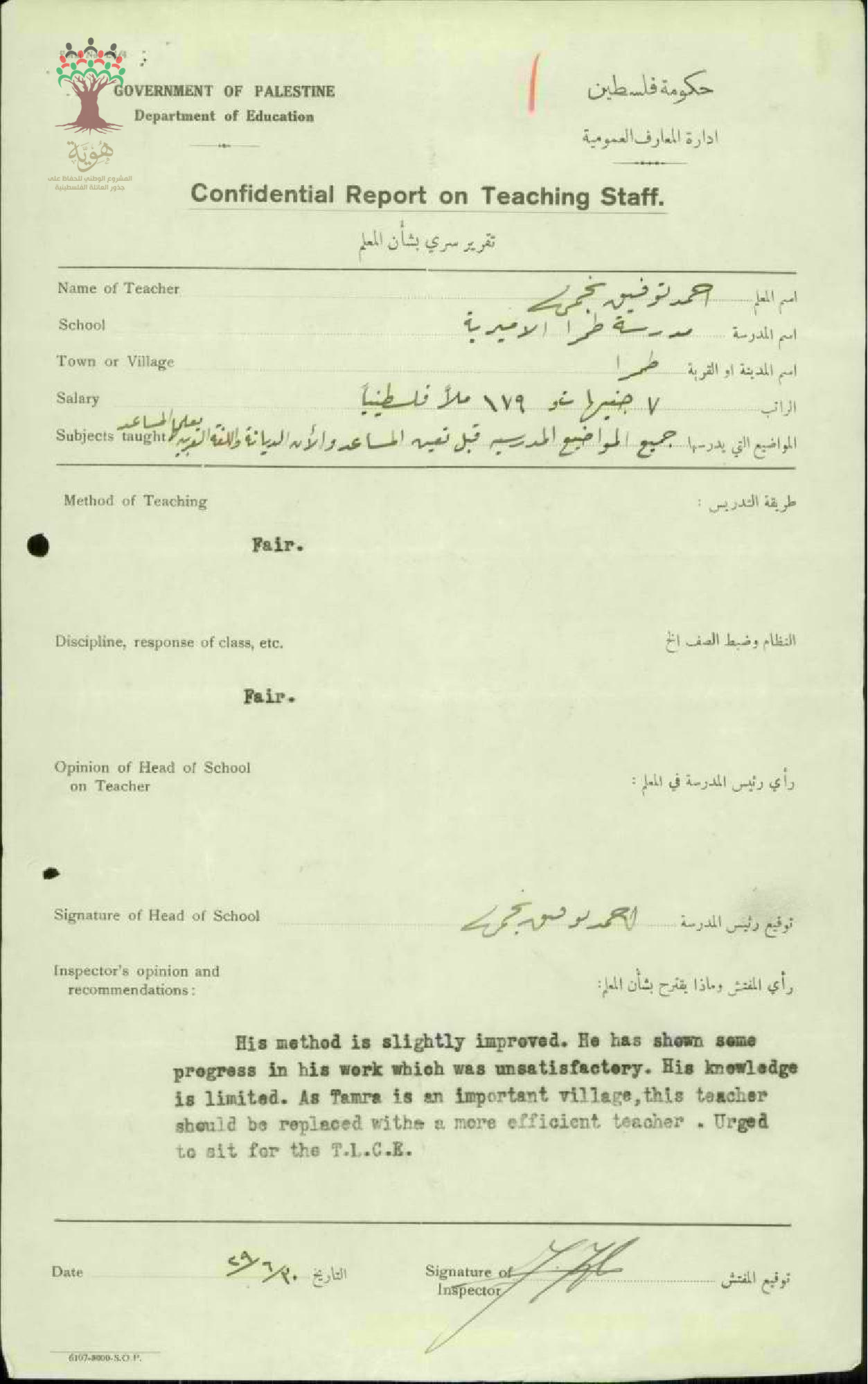 حكومة فاسطين تقرير سري ومعلومات بخصوص ألأستاذ أحمد توفيق النجمي