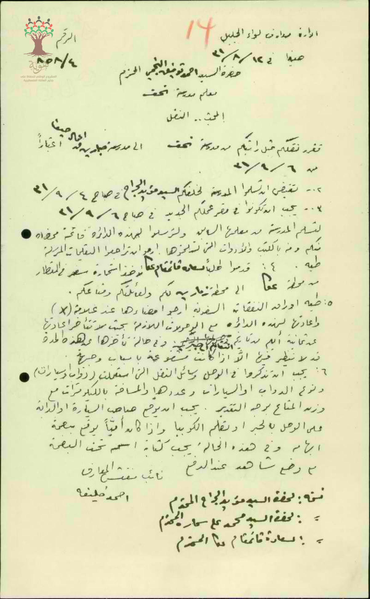 رسالة من معارف الجليل إلى مدير مدرسة نحف أحمد النجمي بخصوص النقل إلى مدرسة جبارين قضاء حيفا