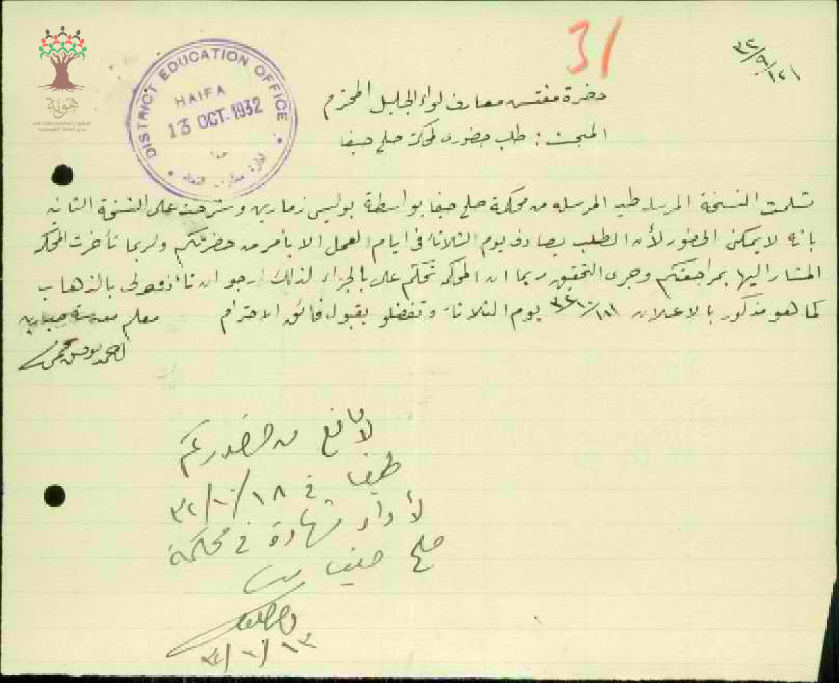 رساله من المعلم احمد توفيق النجمي الى حضرة مفتش معارف الواء الجليل بخصوص الذهاب الى المحكمه