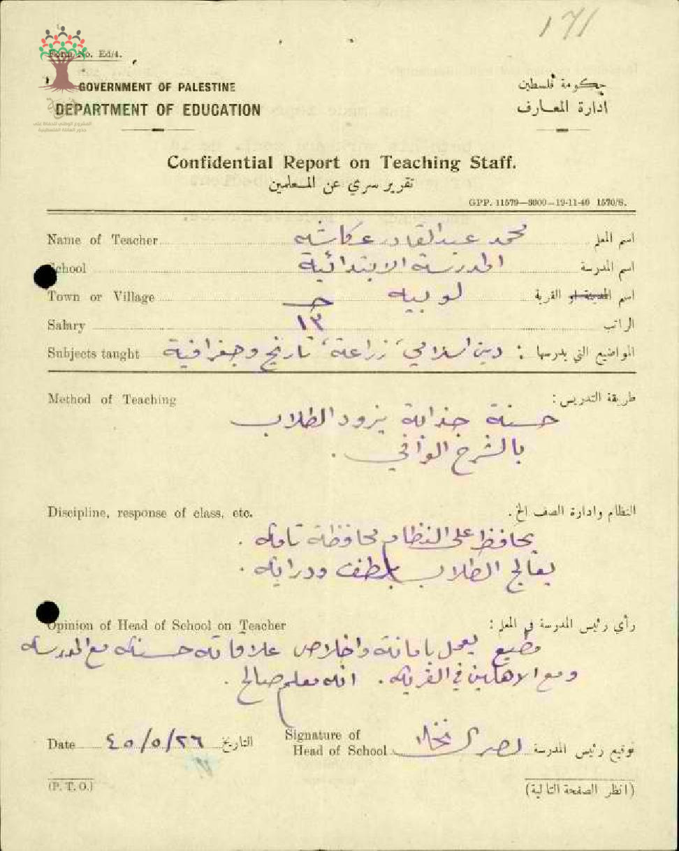 تقرير تفصيلي عن أداء المعلم محمد عكاشة في مدرسة لوبية سنة 1945