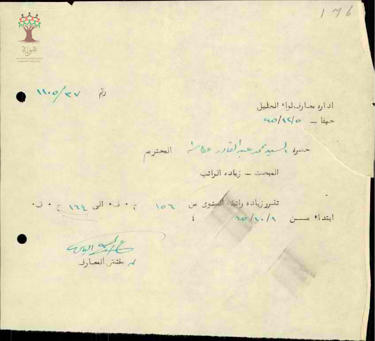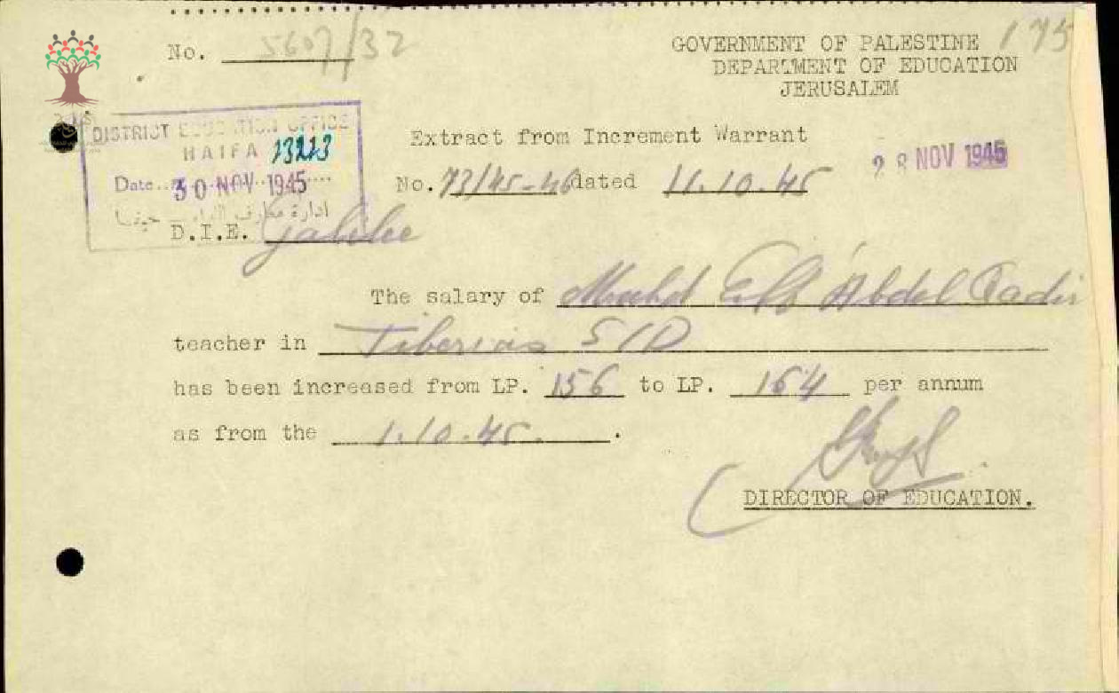 رسالة من مفتش المعارف إلى المعلم محمد عكاشة يعلمه بقرار زيادة راتبه السنوي