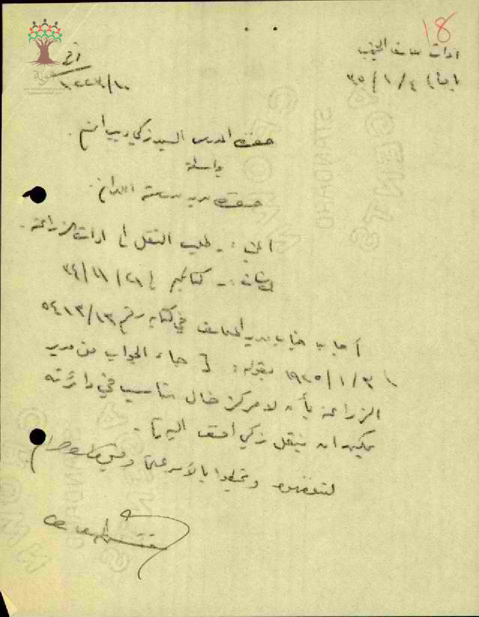 رسالة من مفتش المعارف الى المعلم زكي ديب بخصوص رفض طلب نقله
