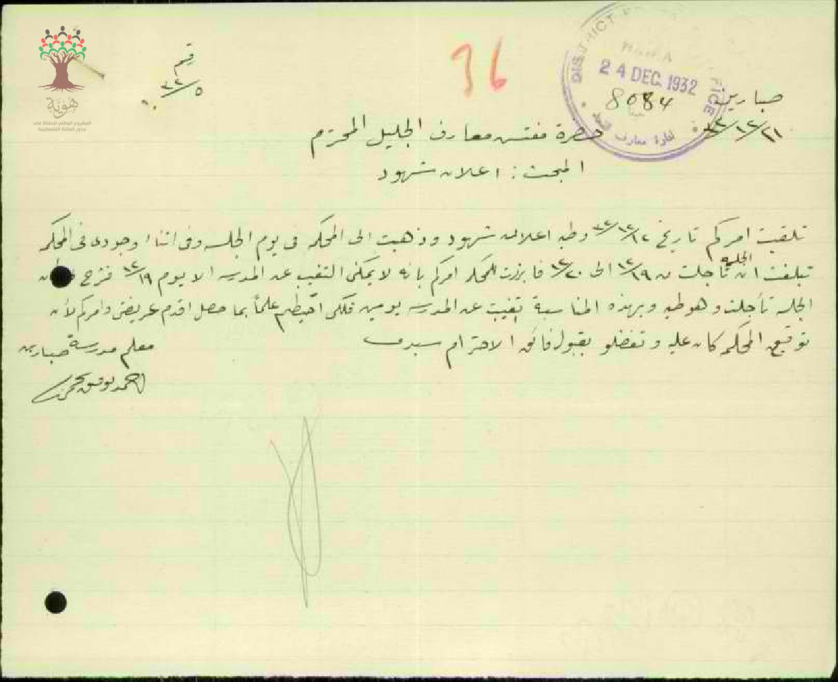 رساله من المعلم احمد توفيق الى حضرة مفتش معارف لواء الجليل بخصوص المحكمه واعلمكن بما حصل