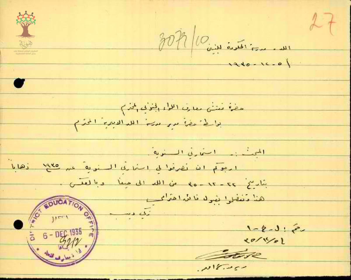 رسالة من المعلم زكي ديب الى مفتش المعارف يطلب فيها استمارته السنوية