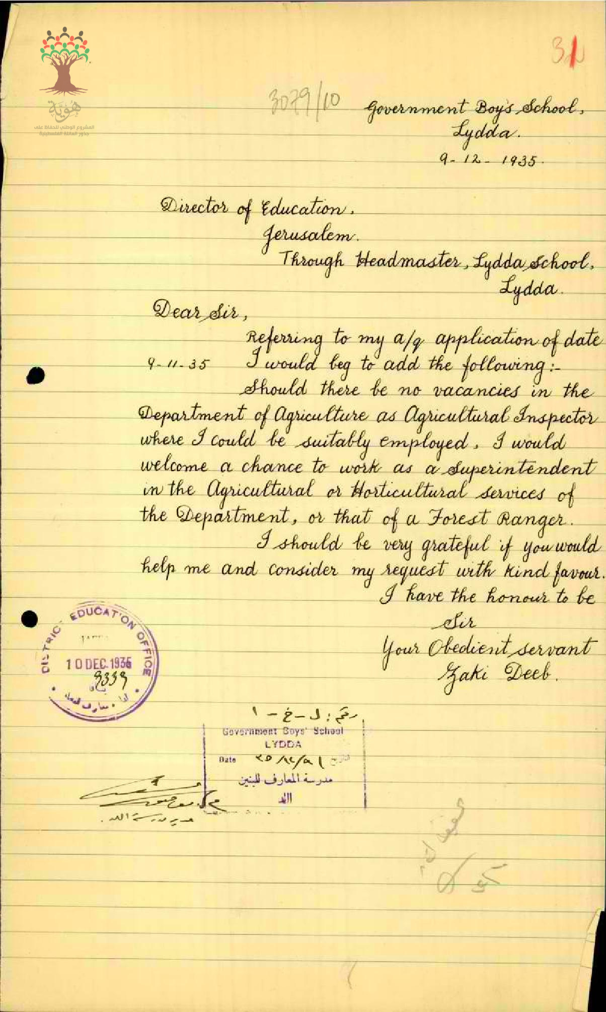 رسالة من المعلم زكي ديب الى مفتش المعارف بخصوص انتقاله الى دائرة الزراعة