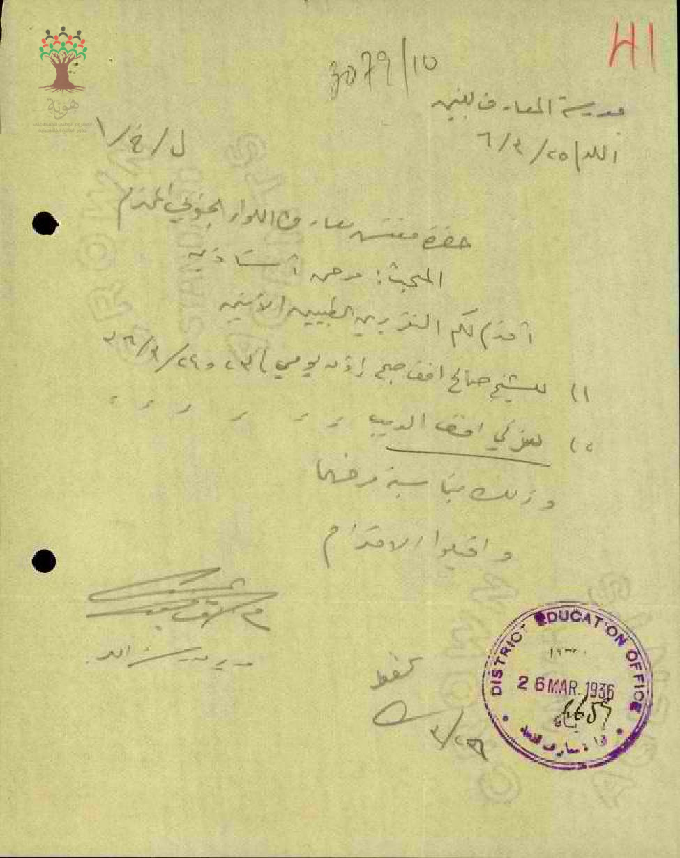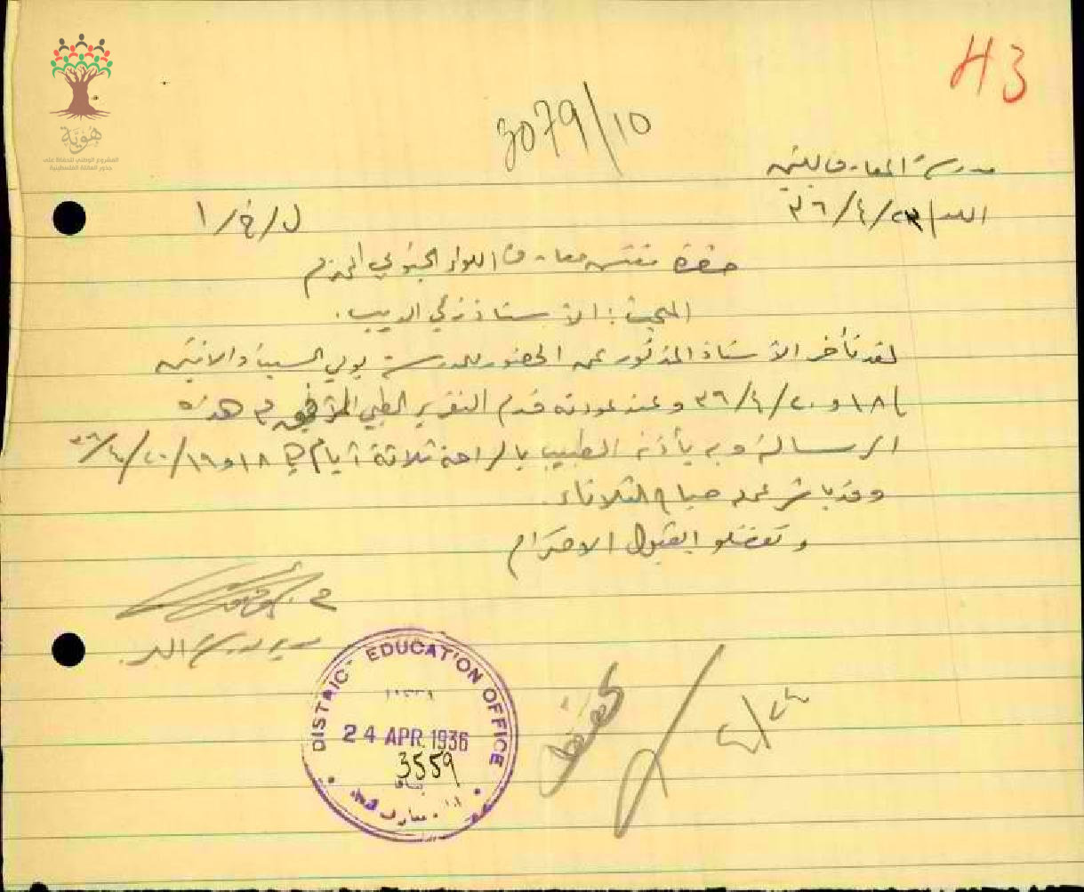 رسائل من مدير مدسة اللد الى مفتش المعارف بخصوص تغيب المعلم زكي ديب وعودته للعمل