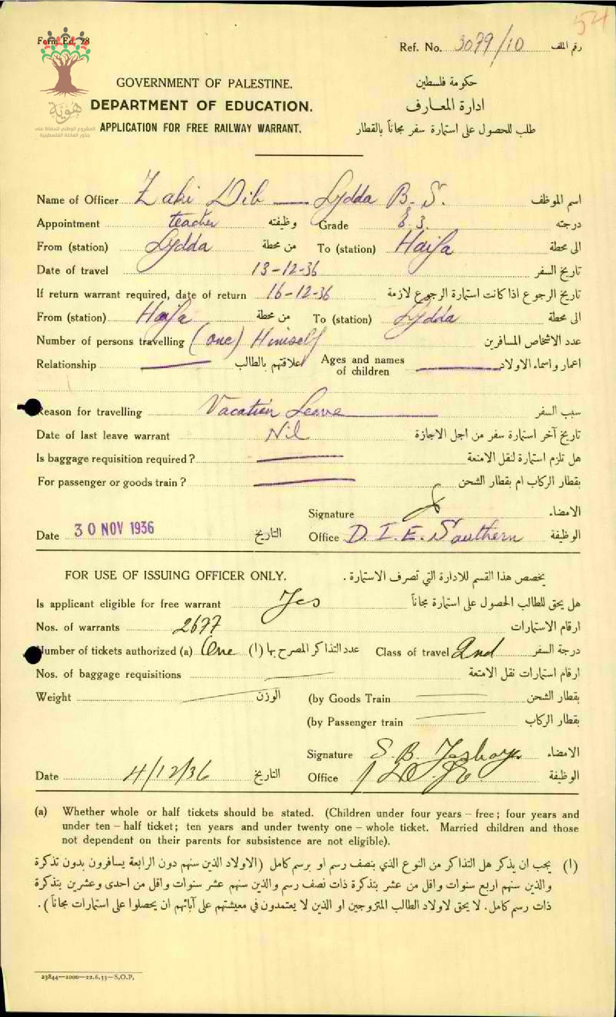 استمارة سفر مقدمة الى المعلم زكي ديب/الرامة