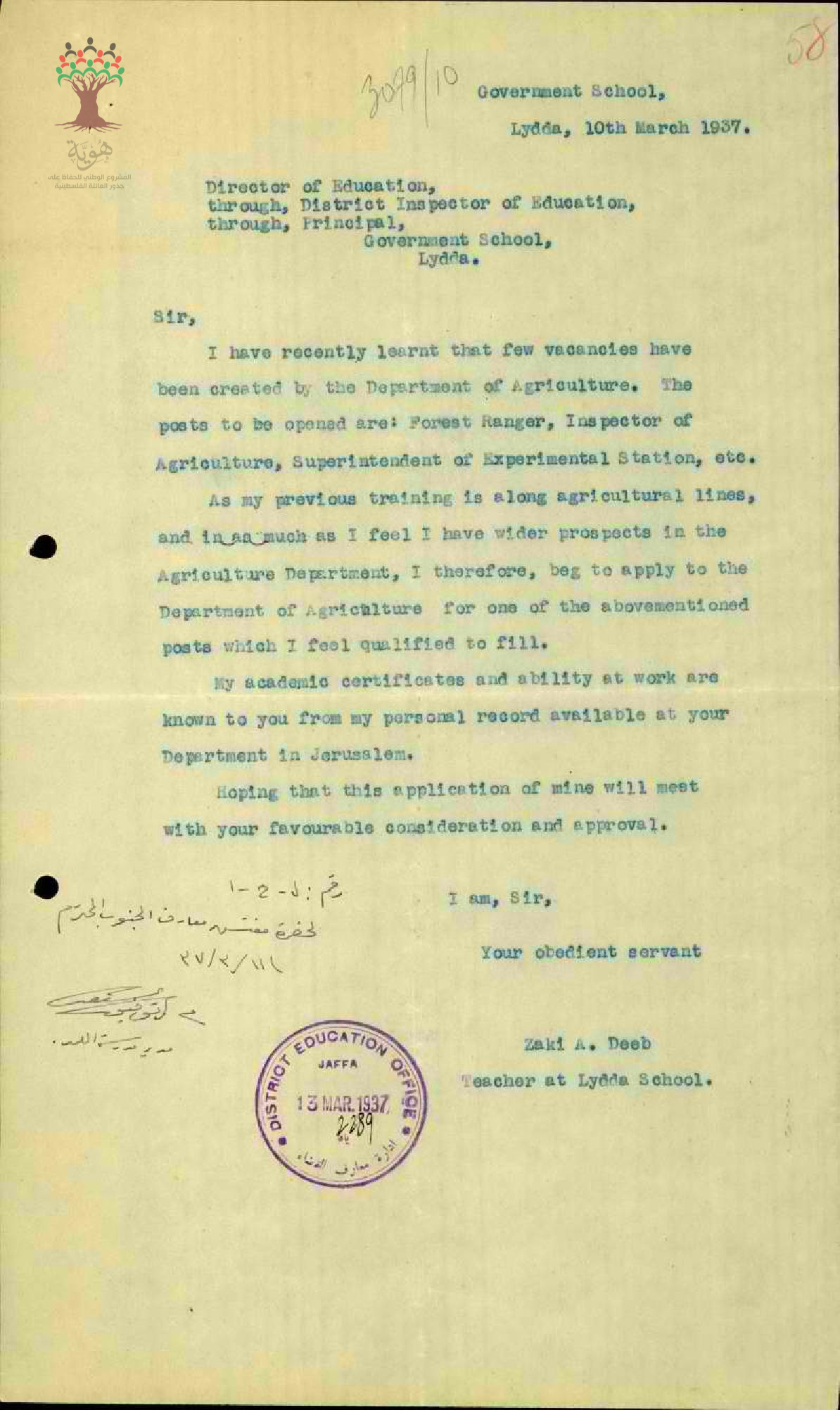 رسالة من المعلم زكي ديب الى مفتش المعارف يطلب فيها نقله الى دائرة الزراعة
