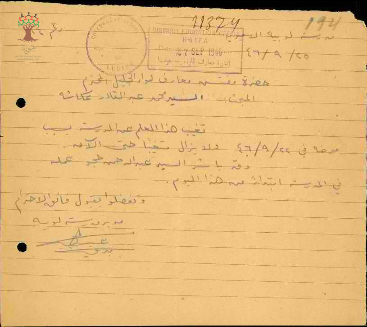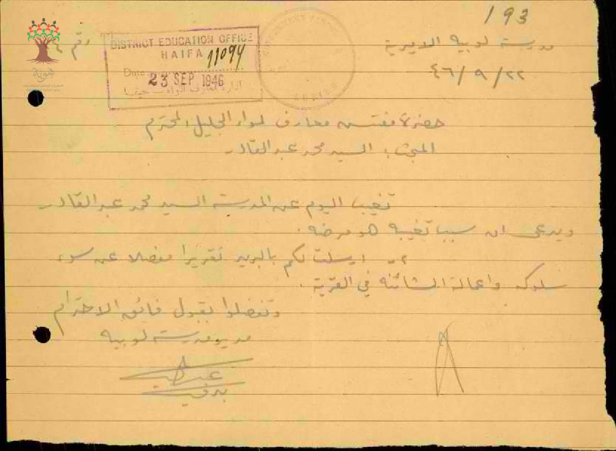 رسائل من مدير مدرسة لوبية إلى مفتش المعارف يعلمه بغياب المعلم محمد عكاشة بسبب المرض