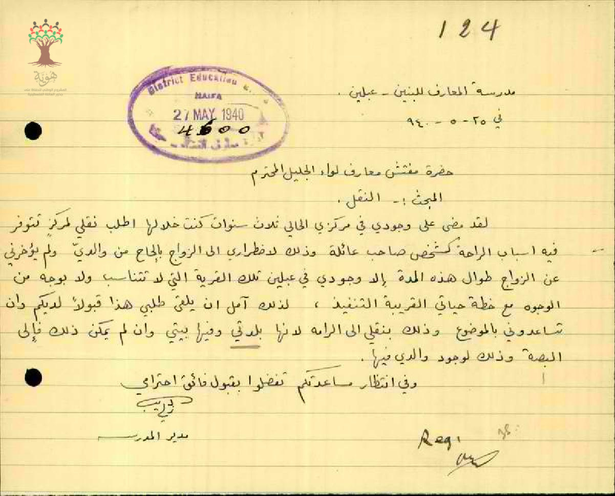 رسالة من المعلم زكي ديب الى مفتش المعارف يطلب نقله من مدرسة عبلين