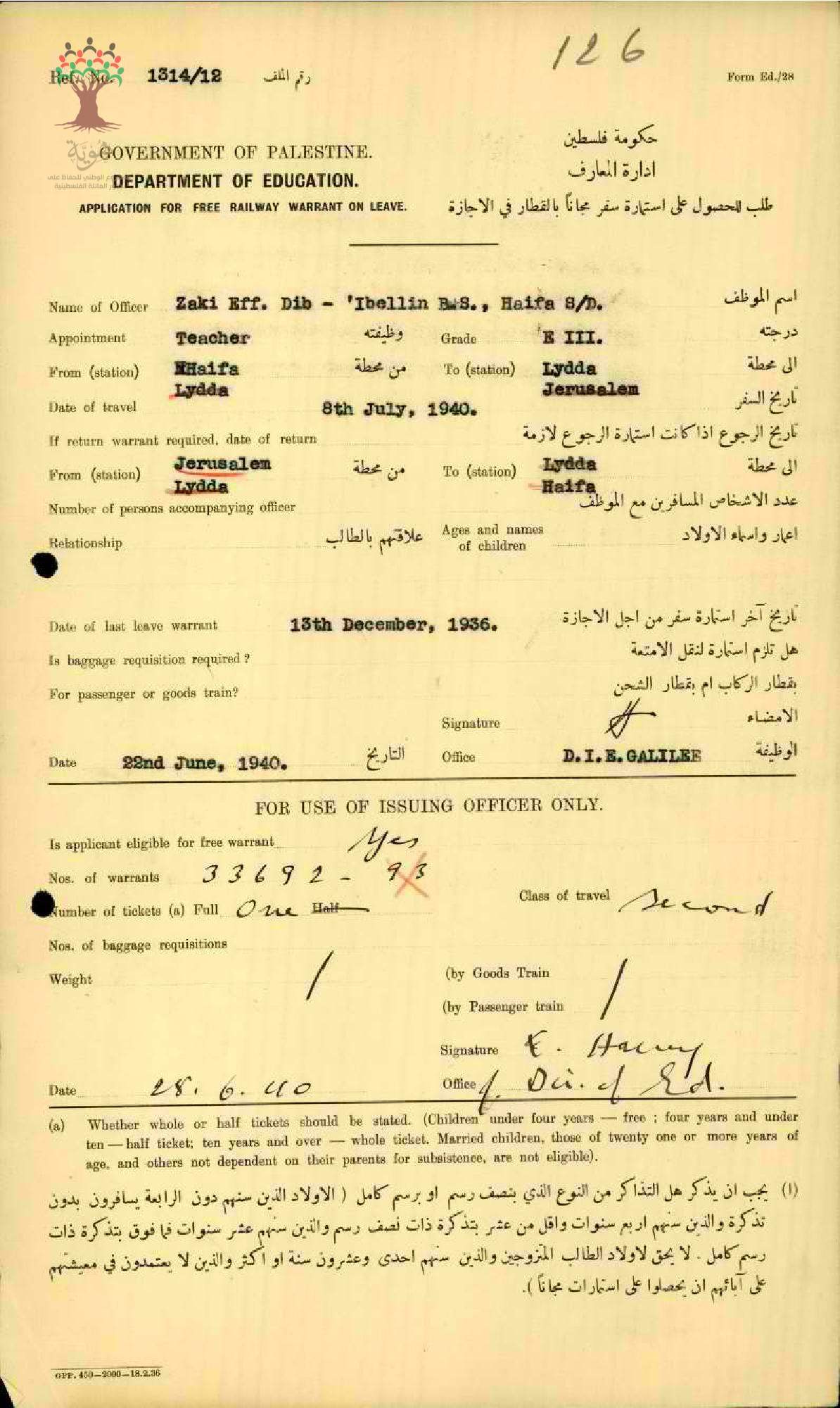 استمارة سفر مقدمة الى المعلم زكي ديب/الرامة