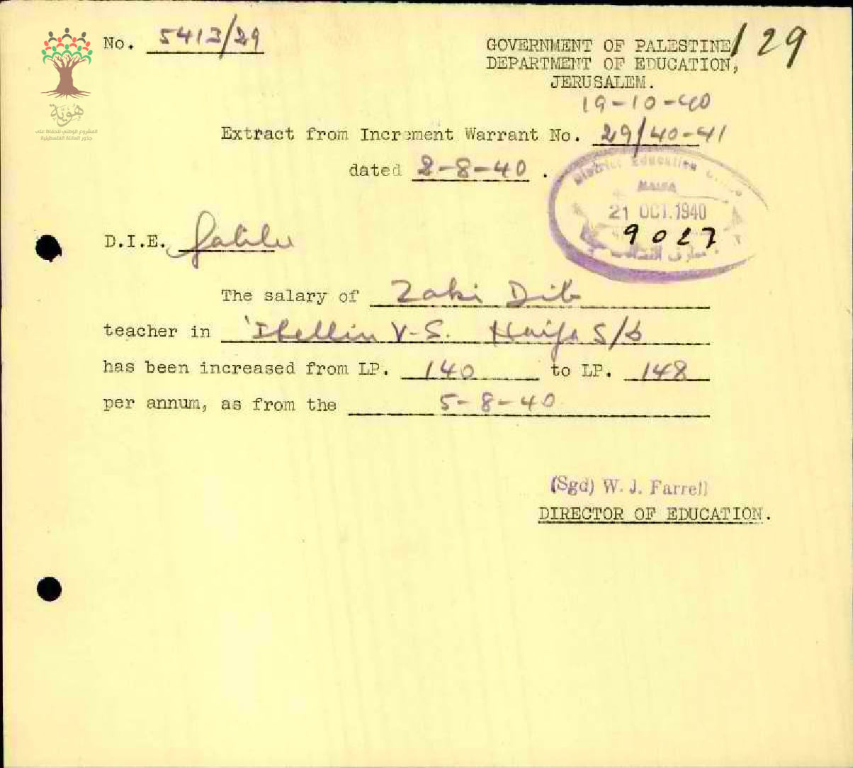 رسالة من مدير المعارف الى مفتش المعارف بخصوص زيادة راتب المعلم زكي ديب السنوية
