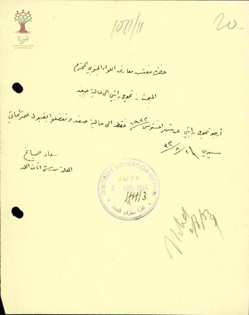 رسالة من المعلمة سعاد صباغ إلى مفتش المعارف تطلب تحويل راتبها إلى مالية صفد