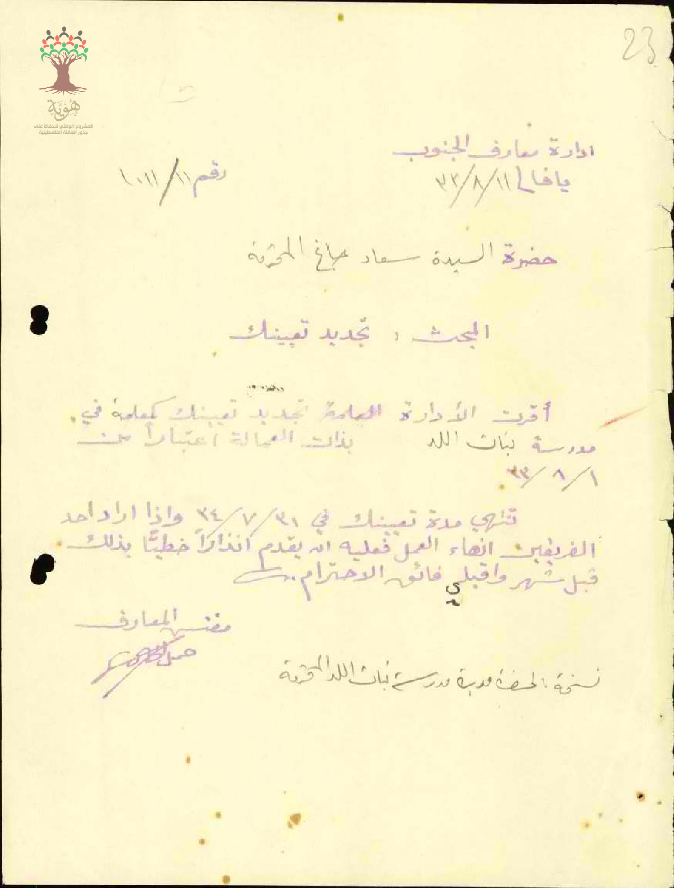 رسالة من مفتش المعارف إلى المعلمة سعاد صباغ يخبرها بتجديد تعيينها في مدرسة بنات اللد