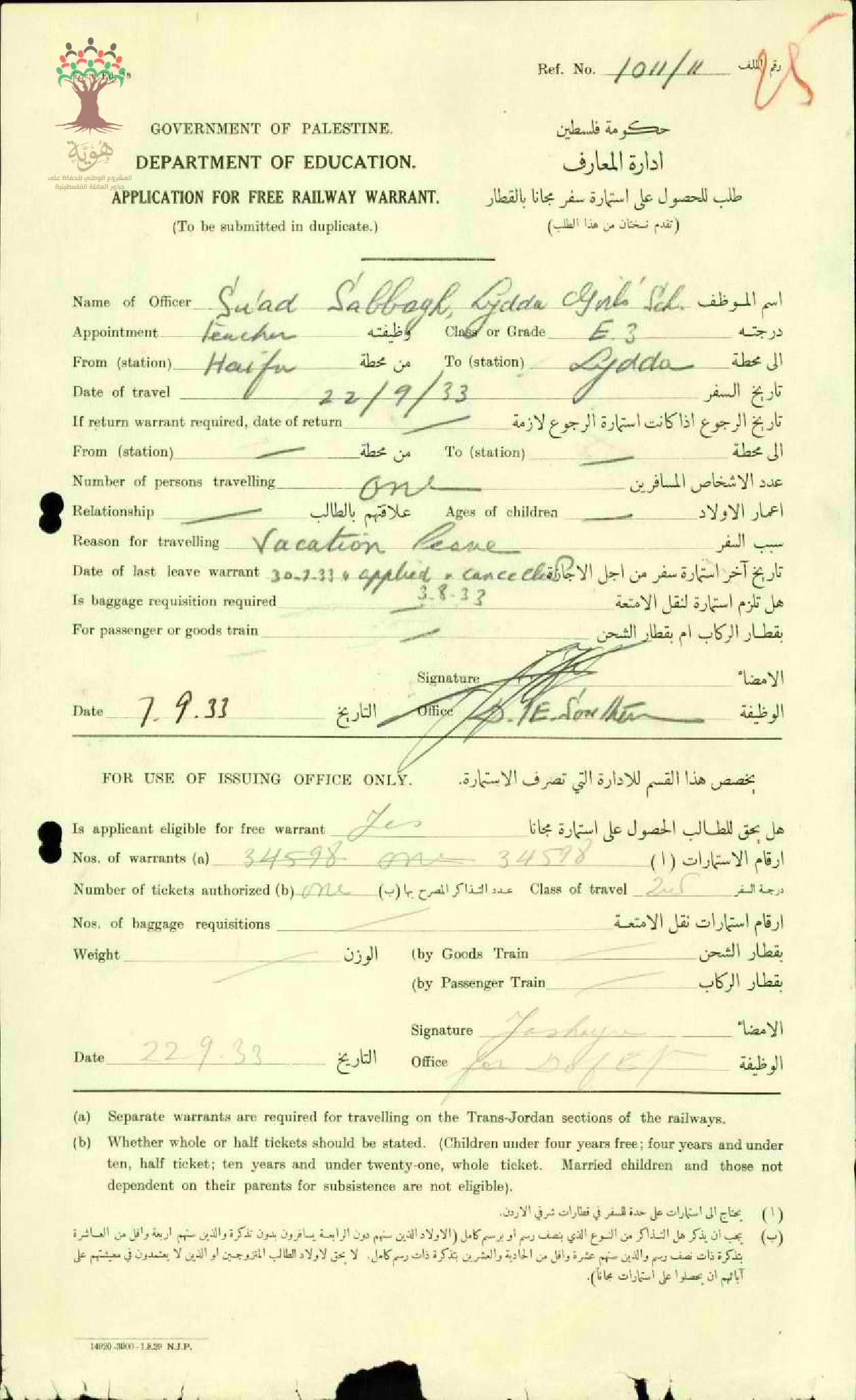 طلب للحصول على استمارة سفر مجاناً بالقطار للمعلمة سعاد صباغ